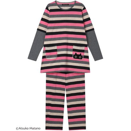 【パジャマ(ロング袖ロングパンツ)】クリエーター“俣野温子”氏がデザインする、甘くなりすぎない大人かわいいテキスタイルとカラーで、くつろぎ時間を楽しく過ごせるパジャマ&ルームウェア・綿100%の天竺素材を使用・色鮮やかなマルチボーダーと袖の無地の切り替えが印象的・左ポケットにあしらった黒猫のアップリケがデザインポイント【サイズ詳細】M:身幅53.5cm 着丈72.0cm 身丈74.5cm 肩幅39.0cm 袖丈55.5cm ボトム脇丈95.0cm 裾まわり43.0cm ウエスト58.0cm ヒップ100.5cm 股下(レングス)67.5cmL:身幅57.5cm 着丈72.0cm 身丈74.5cm 肩幅40.5cm 袖丈55.5cm ボトム脇丈95.5cm 裾まわり45.0cm ウエスト63.0cm ヒップ104.5cm 股下(レングス)67.5cmLL:身幅61.5cm 着丈73.0cm 身丈75.5cm 肩幅42.0cm 袖丈56.0cm ボトム脇丈96.0cm 裾まわり48.0cm ウエスト68.0cm ヒップ109.5cm 股下(レングス)67.5cm※出来上がり寸法を表示しております※サイズ詳細の寸法には多少の差異がございます※アイテムによって柄の出方が異なりますのでご了承ください。