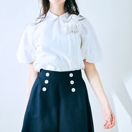 ・小さめの衿にバルーンスリーブが特徴のコサージュ付きブラウス。