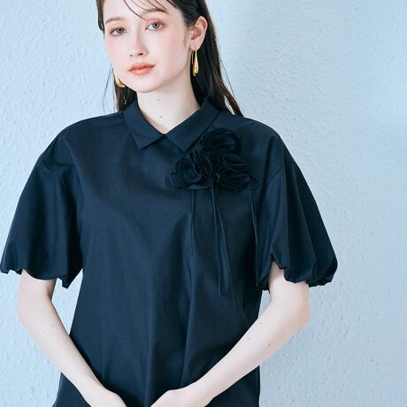 ・小さめの衿にバルーンスリーブが特徴のコサージュ付きブラウス。