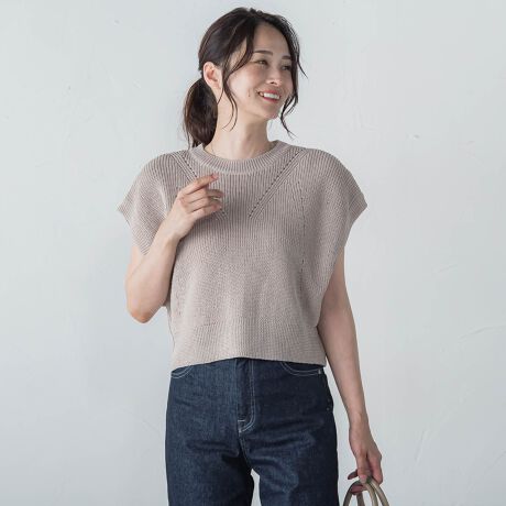 シャリ感のある素材を片畝でざっくり編んだショート丈ベスト。