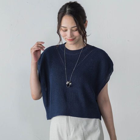 シャリ感のある素材を片畝でざっくり編んだショート丈ベスト。