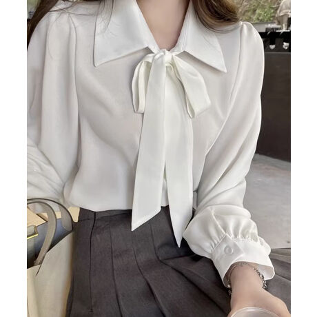 リボンが目を惹く、胸元を華やかに見せてくれる長袖リボンタイブラウスです。