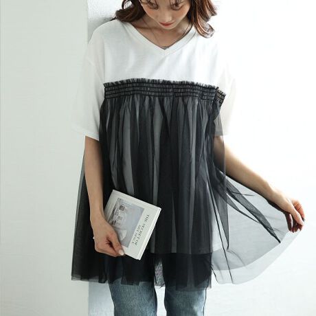 可愛く体型隠し、チュールレイヤードカットソー。カットソーにトレンドのチュールをドッキングしたデザインで、一枚着るだけで旬コーデ完成!360度ぐるっとチュールを施し、どこから見ても抜かりなく可愛い一着です。ふんわり広がるチュールが気になるお腹やヒップラインをカバーしてくれます。王道カジュアルなデニム合わせはもちろん、スキニーやスカートとも相性抜群です。