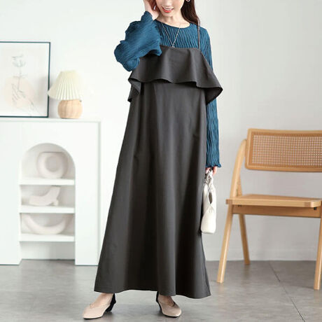 胸元ラッフルに惚れる、ラッフルフリルキャミソールワンピース。胸元のたっぷりフレアラッフルで視線を上げてスタイルアップ見えする一着。体型を拾わずに綺麗めAラインシルエットで女性らしく着痩せ見せしてくれます◎調節可能な肩紐でゆったりとした脇ぐりで着用していただけるので、厚手インナーでも嵩張りません♪お客様の身長に合わせて調節ができるのでちょうどいい着丈でご着用いただけます◎通年着れる軽量ストレッチ布帛生地で着回し力抜群の使える一着です。
