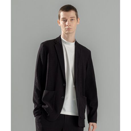 テーラードカラーの2ボタン、プリーツ素材ジャケット。素材を活かしたミニマルなデザイン。