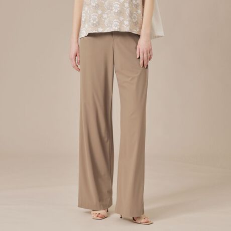 軽量で適度なハリがありさらっとした風合いのトリコット素材です。自然なストレッチ性で動きやすく快適な着用感も特徴です。また、シワが目立ちにくくリラックス感がありながら、綺麗な見た目でエレガントな表情もあります。