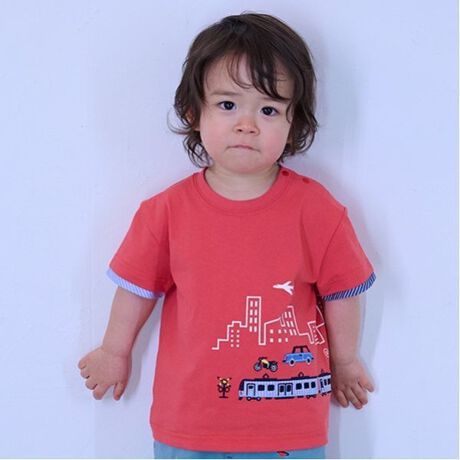 街を走る電車グラフィックが目を引く半袖Tシャツです。