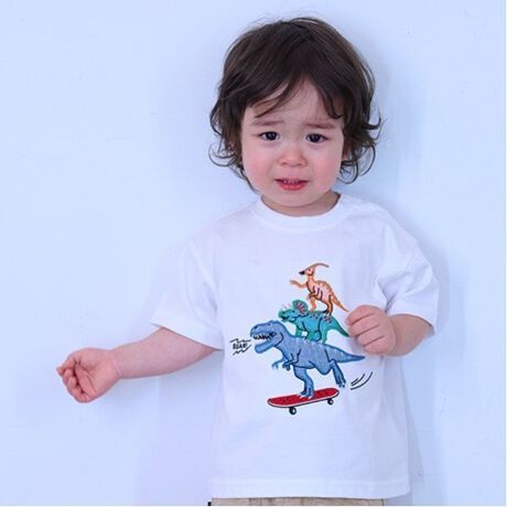 スケボーに乗って遊ぶ恐竜のアップリケが目を引く半袖Tシャツです。