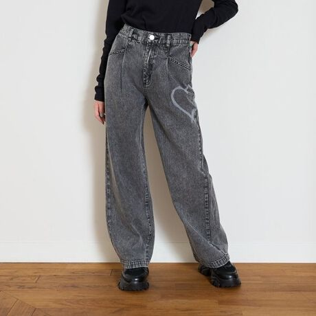 フロントタックと前後にスプレーモチーフをあしらった映えデニム! ウエストにアジャスターゴムがついており、お好みのフィット感に調整できます。