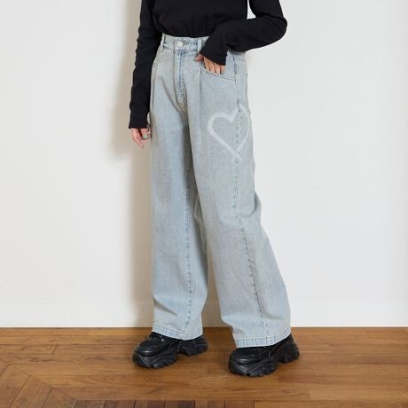 フロントタックと前後にスプレーモチーフをあしらった映えデニム! ウエストにアジャスターゴムがついており、お好みのフィット感に調整できます。