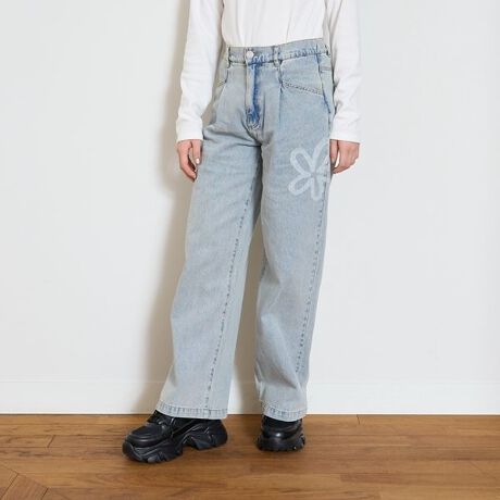 フロントタックと前後にスプレーモチーフをあしらった映えデニム! ウエストにアジャスターゴムがついており、お好みのフィット感に調整できます。