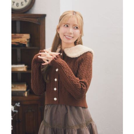 厚手のケーブル編みのニットカーディガンに、ふわふわの丸襟がついたクラシカルなムード高まる一枚。