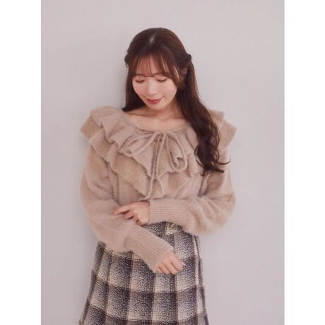 甘いフリルとレースアップデザインがバランスのとれた大人可愛さ満載のニットプルオーバー。