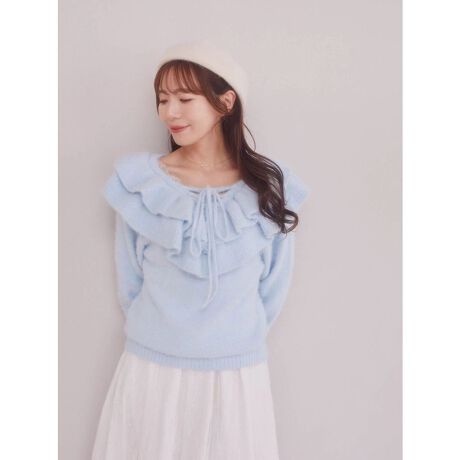 甘いフリルとレースアップデザインがバランスのとれた大人可愛さ満載のニットプルオーバー。
