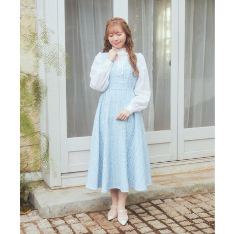 ブラウスとジャンパースカートがドッキングしたような一枚でコーディネートが完成するワンピース。