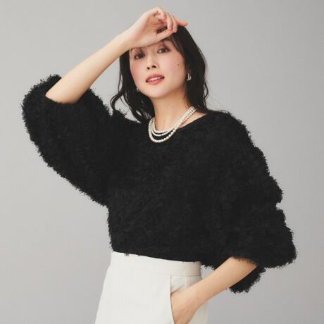 フリンジのようなジャカードにお花のようなフリルが付いている表面感のある素材を使用。