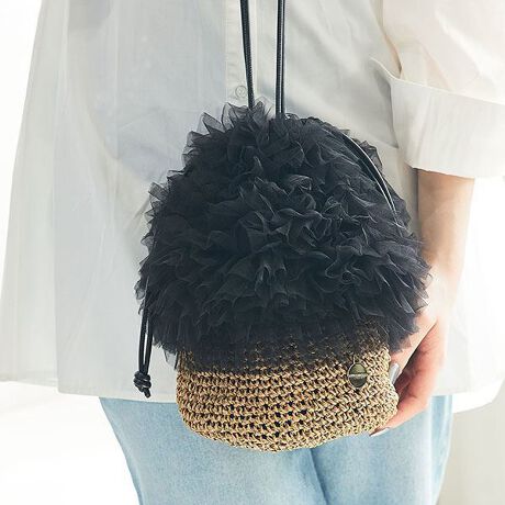 ボリュームたっぷりのエアリーなチュールが目を惹く巾着カゴバッグ。