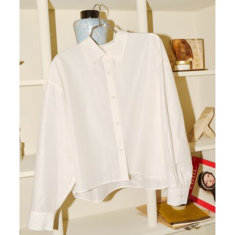 腰上くらいの短め丈で肌離れのあるBOXシルエットで全部閉めても、前を開けて羽織りとしても使えます。
