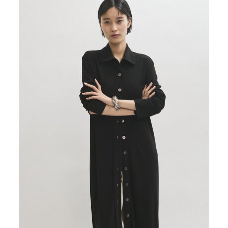 表面に細いリブのような凹凸感のある風合いが特徴的な、ポロ襟のカットソーロングワンピース。