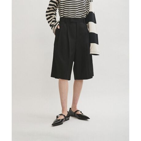 スラックスを切ったような、マーベルト仕様のマニッシュな印象のハーフパンツ。