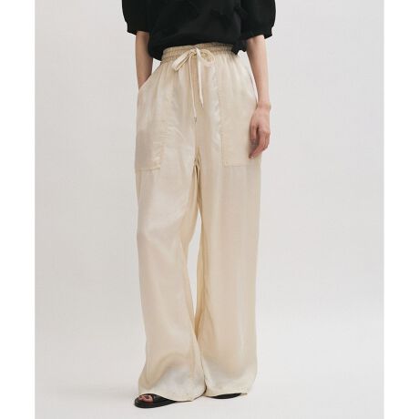 キュプラならではの素材感と製品加工、ゆるっとしたシルエットが絶妙に相まったおすすめのパンツ。