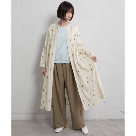 インド綿をベースにシロツメクサ(White clover)の刺繍を施した生地を使用したワンピース。タックを取ってふんわりとさせたボリューム感が春めくデザイン。刺繍を身にまとう特別感のあるアイテムです。羽織としても着られます。両サイドにポケット付き。