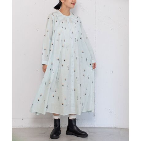 インド綿をベースにシロツメクサ(White clover)の刺繍を施した生地を使用したワンピース。タックを取ってふんわりとさせたボリューム感が春めくデザイン。刺繍を身にまとう特別感のあるアイテムです。羽織としても着られます。両サイドにポケット付き。