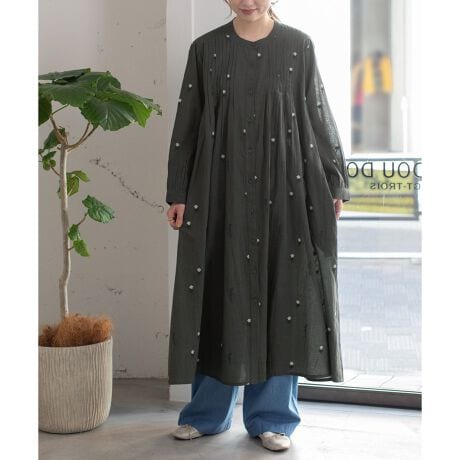 インド綿をベースにシロツメクサ(White clover)の刺繍を施した生地を使用したワンピース。タックを取ってふんわりとさせたボリューム感が春めくデザイン。刺繍を身にまとう特別感のあるアイテムです。羽織としても着られます。両サイドにポケット付き。