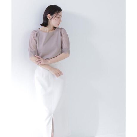 NBBで毎年人気のシアープリーツニットが今年も登場!袖は透け感とさり気ない光沢感がポイントで、通勤にもオフスタイルにもぴったりなデザインです。襟はボートネックで顔まわりをスッキリ見せ、袖はやさしいパフスリーブで女性らしいフォルムを演出。袖口のメタル釦もポイントで、よりキレイ目な印象に見せてくれます。どんなボトムとも合うおすすめのアイテムです。<素材>身頃は清涼感のある糸でフラットな天竺編み。袖は透け感と控えめな光沢のある糸でリブ編みにしています。<詳細>仕様・開閉なし裏地・なし透け感・袖のみあり / 光沢・ややあり / 伸縮性・あり 生地の厚さ・普通※モデルの着用画像の場合、光の当たり具合により、実際の色味と異なって見えることがございます。色味は、商品単体の画像をご参照ください。