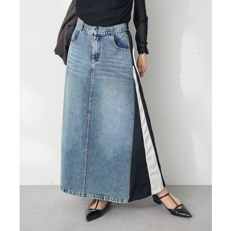 *デニムとハリ感のあるタフタ調生地を前後でジョイントしたハイブリットなスカート。・デニムとナイロン生地をリメイク風に切り替えたスカート。