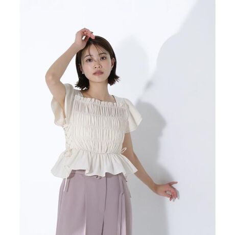 身頃のシャーリングとサイドのレースアップとの組み合わせがスペシャルなブラウスです。フィット感がありながらもシャーリングなので着心地が良い1枚。コンパクトなシルエットのため、ボトムと合わせやすいデザインです。<素材>華奢な楊柳素材を使用しています。<詳細>仕様・開閉なし裏地・なし透け感・なし / 光沢・なし / 伸縮性・なし 生地の厚さ・普通※モデルの着用画像の場合、光の当たり具合により、実際の色味と異なって見えることがございます。色味は、商品単体の画像をご参照ください。