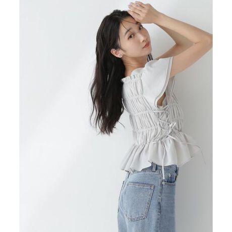 身頃のシャーリングとサイドのレースアップとの組み合わせがスペシャルなブラウスです。フィット感がありながらもシャーリングなので着心地が良い1枚。コンパクトなシルエットのため、ボトムと合わせやすいデザインです。<素材>華奢な楊柳素材を使用しています。<詳細>仕様・開閉なし裏地・なし透け感・なし / 光沢・なし / 伸縮性・なし 生地の厚さ・普通※モデルの着用画像の場合、光の当たり具合により、実際の色味と異なって見えることがございます。色味は、商品単体の画像をご参照ください。
