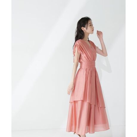 すっきりとしたVネックのティアードワンピースは、1枚で華やかな印象に着映えるデザイン。袖はドローストリングで袖丈の調節ができ、ドロスト先はリボン結びでフェミニンな印象に見せてくれます。ウエストの切り替えベルトにはギャザーを寄せてポイントをプラス。スカート部分はアシンメトリーなティアードデザインで、動くたびにふわっと揺れるシルエットを演出します。<素材>程よいハリ感とシアー感のある素材を使用しています。<詳細>仕様・後ろファスナー裏地・あり透け感・あり / 光沢・ややあり / 伸縮性・なし生地の厚さ・薄手※モデルの着用画像の場合、光の当たり具合により、実際の色味と異なって見えることがございます。色味は、商品単体の画像をご参照ください。