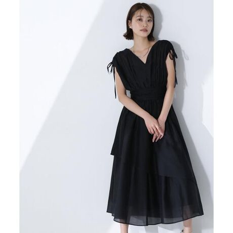 すっきりとしたVネックのティアードワンピースは、1枚で華やかな印象に着映えるデザイン。袖はドローストリングで袖丈の調節ができ、ドロスト先はリボン結びでフェミニンな印象に見せてくれます。ウエストの切り替えベルトにはギャザーを寄せてポイントをプラス。スカート部分はアシンメトリーなティアードデザインで、動くたびにふわっと揺れるシルエットを演出します。<素材>程よいハリ感とシアー感のある素材を使用しています。<詳細>仕様・後ろファスナー裏地・あり透け感・あり / 光沢・ややあり / 伸縮性・なし生地の厚さ・薄手※モデルの着用画像の場合、光の当たり具合により、実際の色味と異なって見えることがございます。色味は、商品単体の画像をご参照ください。