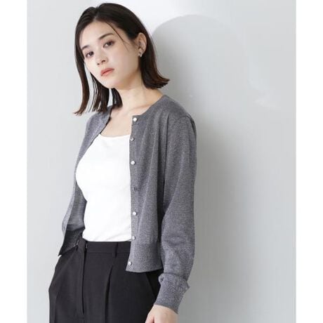 ボタンを全て留めてトップス風にも、羽織りとしても使えるプレーンなクルーネックデザインのカーディガン。コンパクトな丈なのでハイウエストボトムやワンピースとも相性抜群です。ラメ糸の色に合わせた金属ボタンがきらっとポイント。シアー感があるのでインナーキャミソールやタンクトップと合わせると、ほどよく透け感を活かしたレイヤードスタイルを楽しめます。<素材>繊細なラメ糸を引き揃えた軽い天竺編みニットです。<詳細>仕様・前ボタン裏地・なし透け感・ややあり / 光沢・あり / 伸縮性・あり生地の厚さ・普通※モデルの着用画像の場合、光の当たり具合により、実際の色味と異なって見えることがございます。色味は、商品単体の画像をご参照ください。