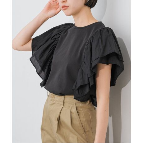 袖が布帛になっていて華やかさもありながらシンプルカラーで着回しやすい万能トップス。