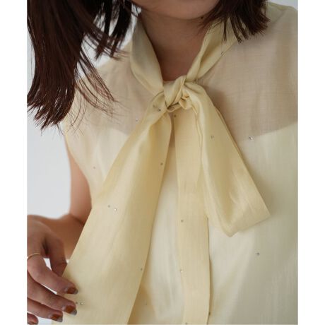 ・軽く透け感のある素材を使用したノースリーブのボウタイブラウス。