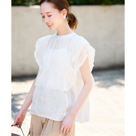 ・二の腕が隠れるフリル袖のフェミニン見えブラウス