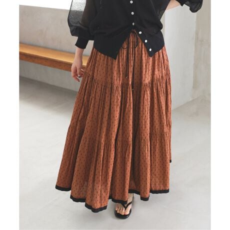 シンプルなトップスとのスタイリングも華やぐスカートです。