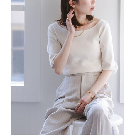 袖はタイトな5分袖。シンプルでバランスを取りやすく、ジャケットのインナーからワイドボトムスと合わせて1枚着としても最適です。