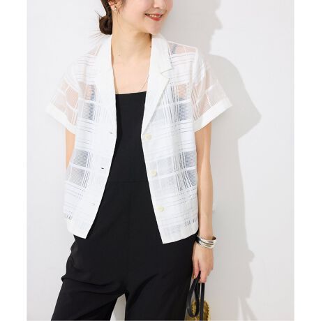 ・透け感のあるシャドーチェック素材を使用した開襟のデザインブラウス。