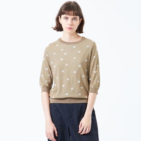 フラワーモチーフが上品で華やかなニットプルオーバー。キレイ目スカートにもカジュアルなパンツにも相性が良く、幅広いコーディネートにマッチします。