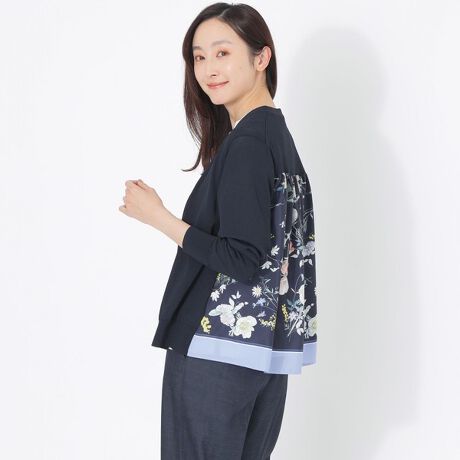 前身頃はシンプルなVネックカーディガン、でも後ろは華やかなプリント柄とのコンビニットです。プリント接ぎも斜めに編み増やしたテクニカルなデザインです。ネイビーは華やかなマルチ柄「SPRINGFLOWER GARELLY」、ブルー系はシックにトーナル調のスミレ柄です。同色染の貝ボタンを使用しています。