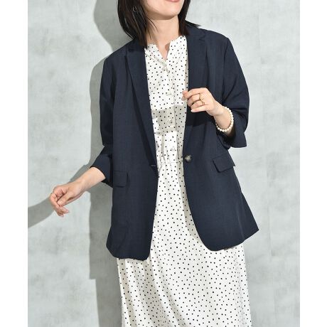 さらりとした肌さわりが特徴の麻調ライクな素材で作られたジャケット。ボトムスや体系を選ばず着まわしやすい着丈にこだわった1枚です。1つボタン開きのすっきりしたシルエットは女性らしく、インナーも合わせやすいのがポイントです。