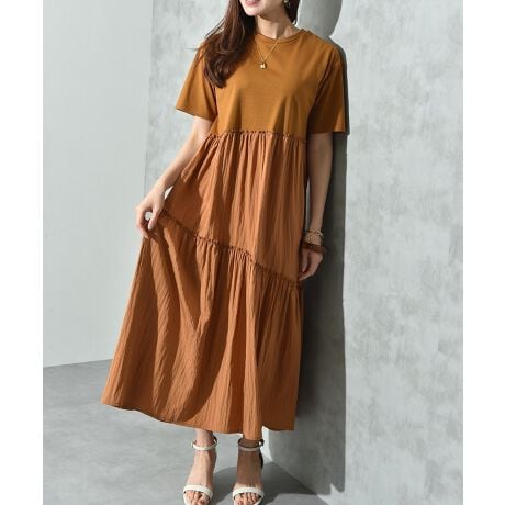 生地を贅沢に使ったボリューム感のあるシルエットが大人な印象に見せてくれます。裾にかけてふわりと広がるエアリーなボリューム感が女性らしく、長めの半袖も気になる二の腕をカバーしてくれる嬉しいポイントです。身頃と袖に通気性・吸水性に優れたコットンを使用。スカート部分は綺麗な落ち感のあり、柔らかく肌触りの良いレーヨン素材が特徴です。洗うたびに肌になじむ独特な風合いとナチュラルな風合いをお楽しみいただけます。カラーは長いシーズン使えるブラウンとチャコールグレーをご用意しました。