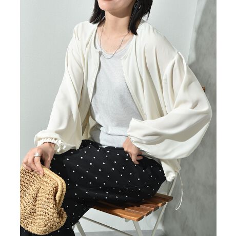 上品な光沢とドレープ感が魅力のデシン素材。絶妙な表面感が美しく、カジュアルなアイテムの中に大人の余裕を感じさせてくれます。シワになりにくくさらりとした風合いも嬉しいポイントです。裏地がないことでシャツ感覚で羽織れる軽さも◎さらりと肩の力を抜いて着られるブルゾンです。ノーカラーでスッキリしたデザインに裾と袖口にゴムを使用し、シンプルな中にも女性らしさが漂う1枚。