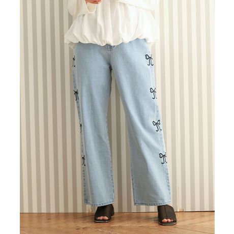 両サイドにリボンのモチーフ刺繍をあしらった、1枚で着映えるデニムパンツ。ウエスト位置の高い深めの股上と、縦長見えするワイドのストレートラインでスタイルアップ効果も嬉しいデザインです。後ろゴム仕様の快適な履き心地もポイント。コンパクトなトップスと相性良く、プラスオンするだけで旬なスタイリングを楽しめるおすすめなアイテムです。透け感[なし]