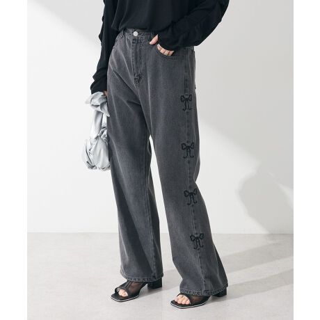 両サイドにリボンのモチーフ刺繍をあしらった、1枚で着映えるデニムパンツ。ウエスト位置の高い深めの股上と、縦長見えするワイドのストレートラインでスタイルアップ効果も嬉しいデザインです。後ろゴム仕様の快適な履き心地もポイント。コンパクトなトップスと相性良く、プラスオンするだけで旬なスタイリングを楽しめるおすすめなアイテムです。透け感[なし]
