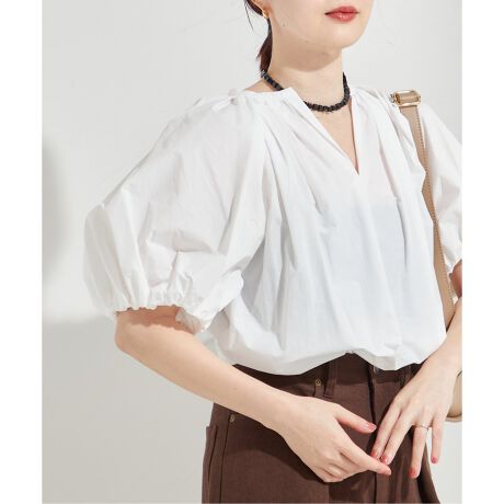 折り返したデザインのスキッパーネックの開きや、身頃はボックス型でフェミニンになりすぎず