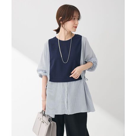 ベストとシャツをレイヤードしているようなこなれた印象のチュニックプルオーバー。ゆったりとしたシルエットで着心地よく、サイドリボンを調節してお好みのシルエットに変えられるのも魅力的です。腰までかかる長めの着丈でスタイルアップ効果にも期待。スキニーやワイドボトムなど様々なボトムと相性よく、デイリーに活躍してくれるおすすめのアイテムです。透け感[ややあり]
